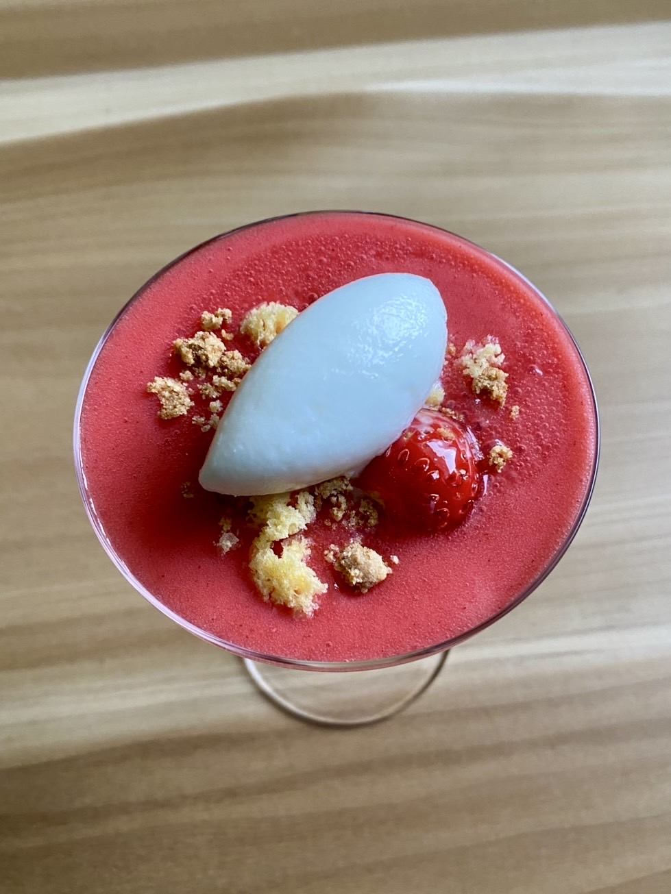 小さな苺を飴がけに、苺のスパークリングと濃縮したミルクのソルベを浮かべたシュワシュワの苺ミルクを表現